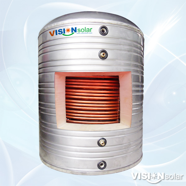 Depending on the system design the atmospheric tank may incorporate one or several heat exchangers for indirect solar water heating or other heating applications.